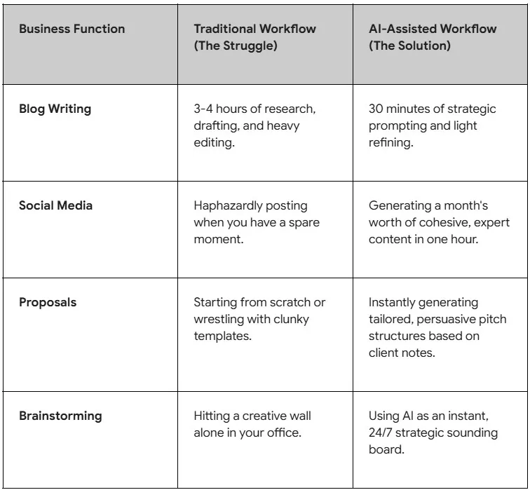 This is how small businesses level the playing field. Large agencies have teams of junior copywriters and assistants. With effective AI upskilling, you have an instant, scalable team at your fingertips. You can produce the same volume of high-quality, authoritative content as the big players, establishing a stronger, more credible brand presence, all while maintaining the agility of a small business.